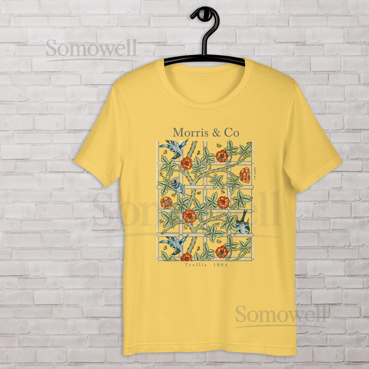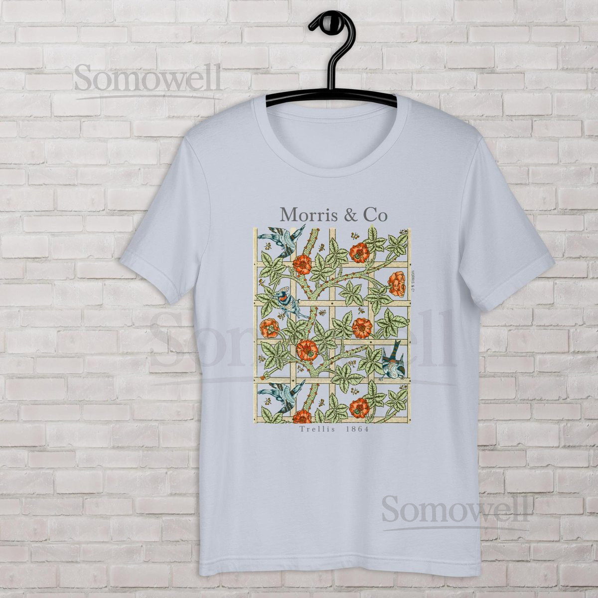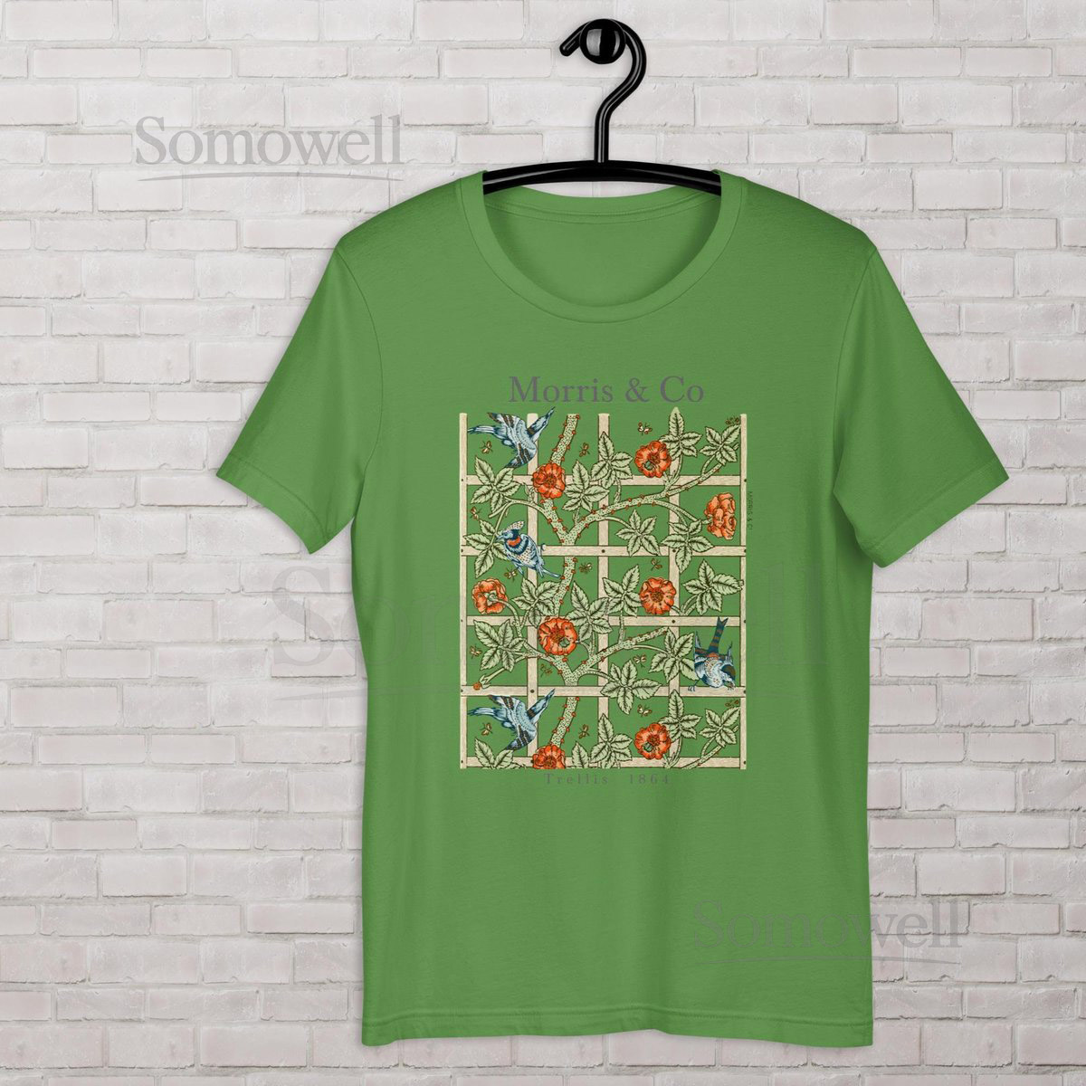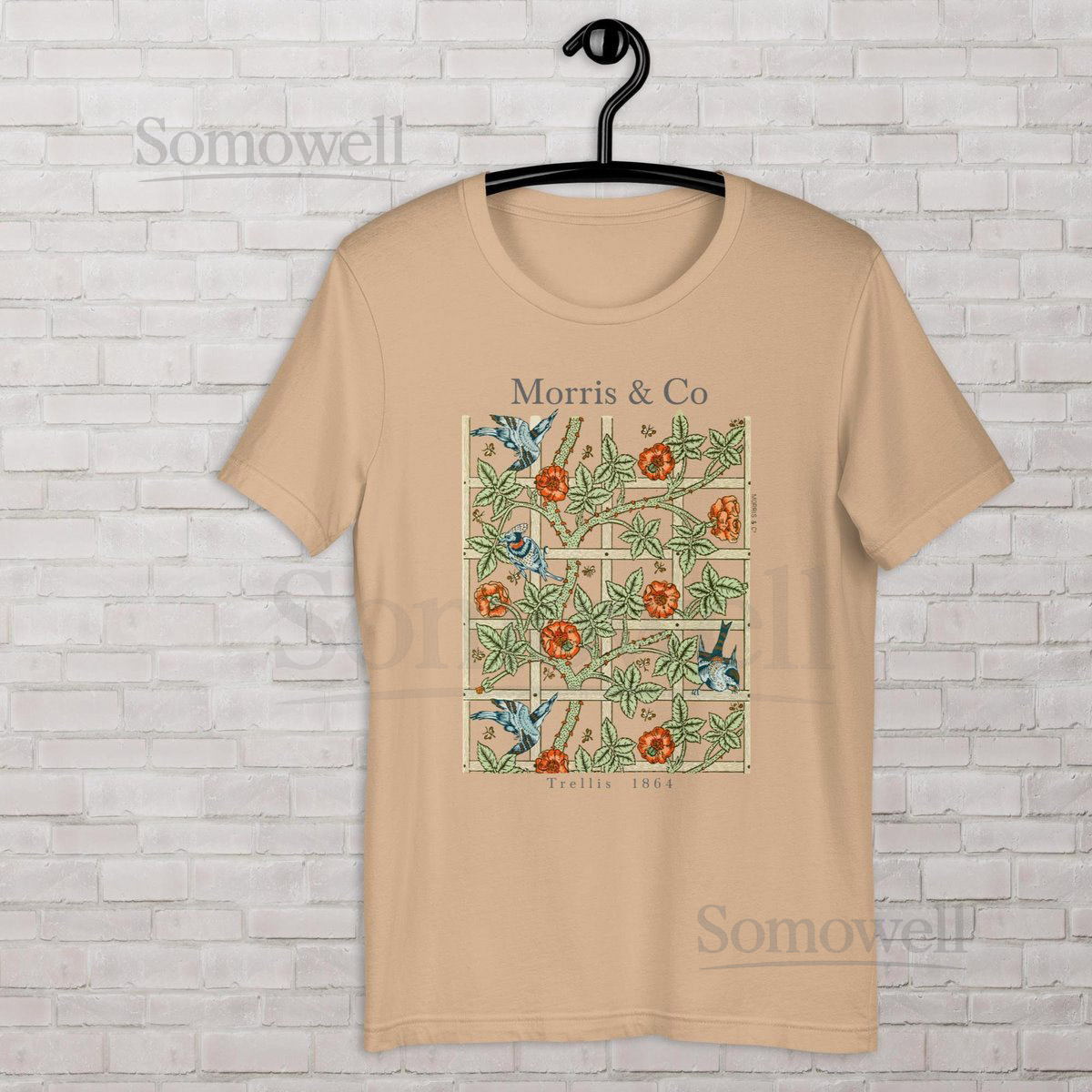 UnisexT-Shirt design William Morris Trellis Pattern Blue Birds and Pink Roses bush Vintage flowers shirt Cottagecore Tee plants Tee_955