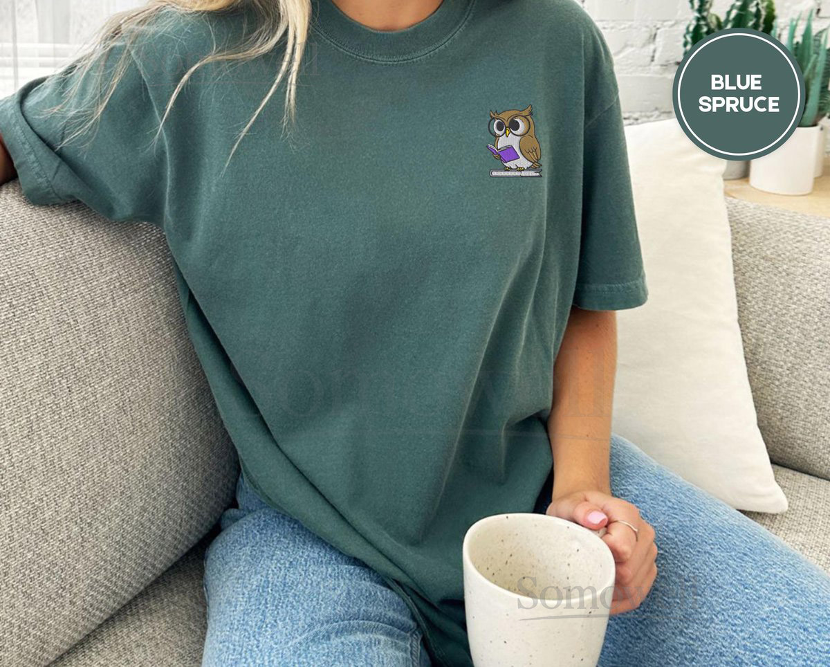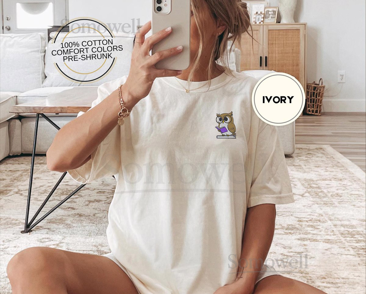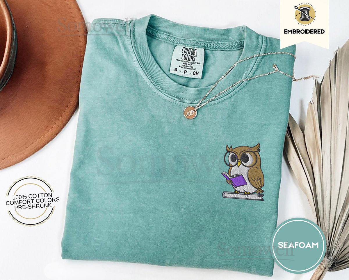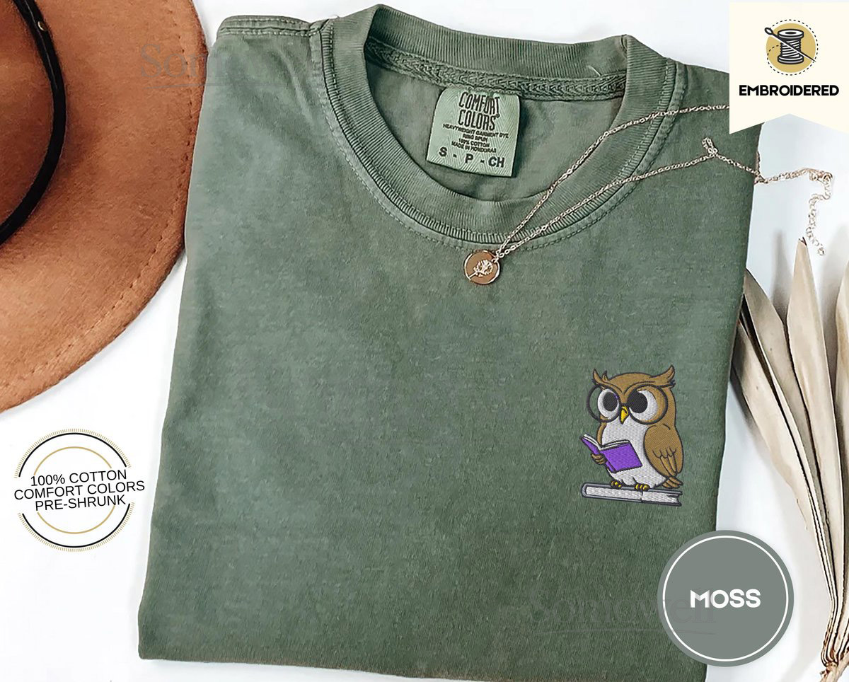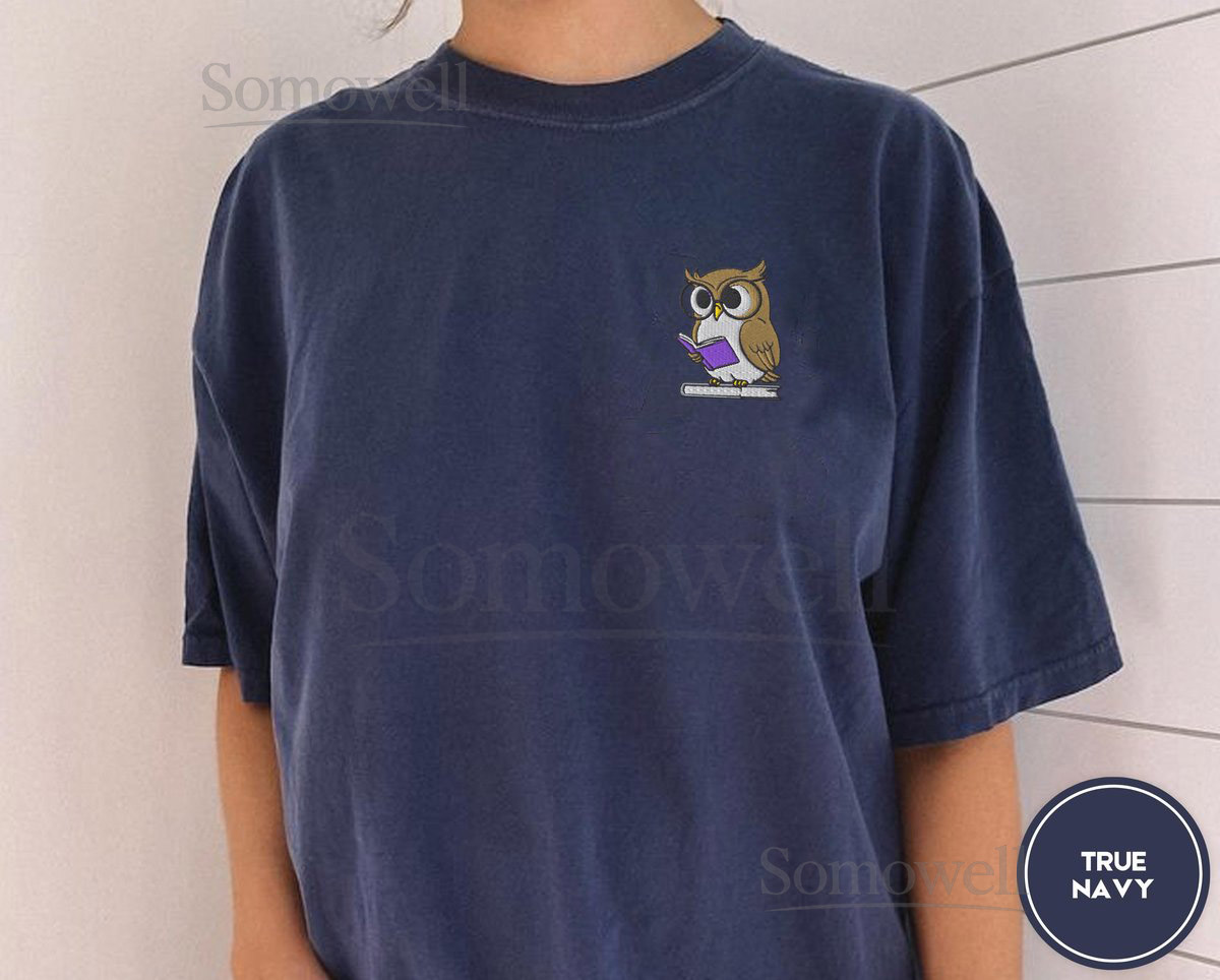 Embroidered Owl Reading Comfort Colors Tee Late night readers book club gift night owl bookstagram booktok merch retro literary bookworm_90