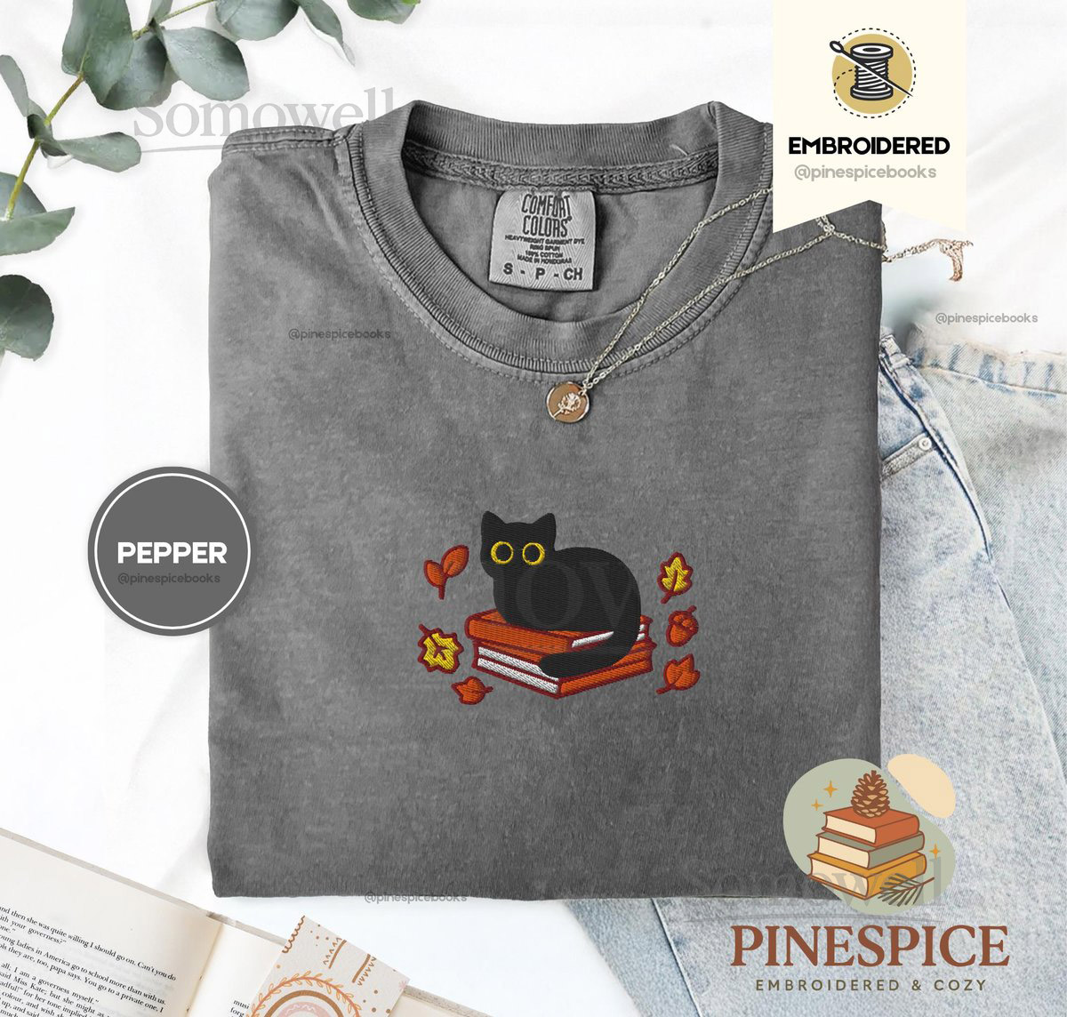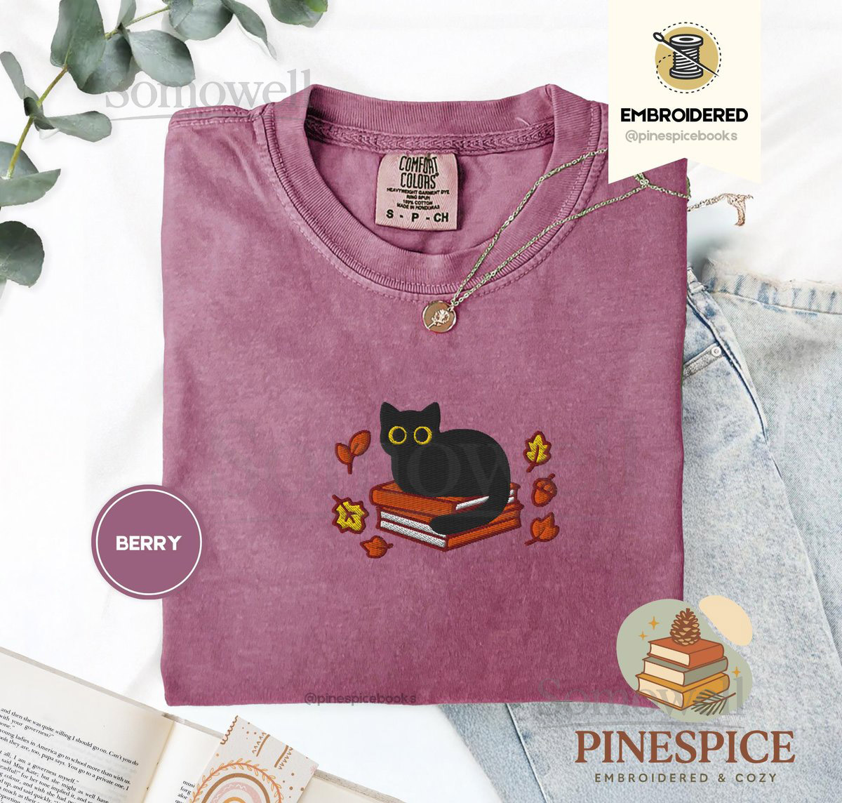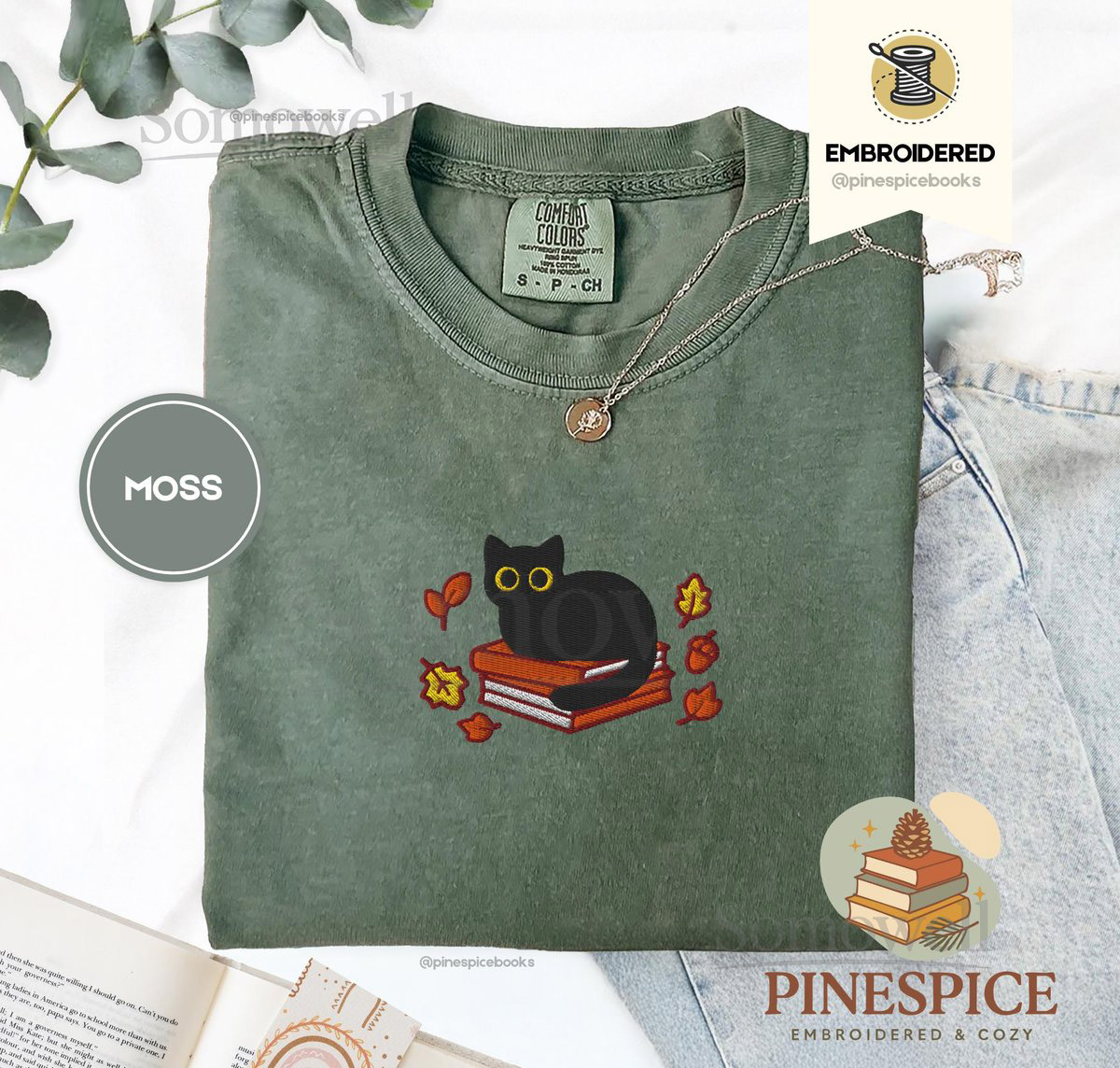 Fall Black Cat and Books Tee Embroidered Comfort Colors 1717 Cozy Autumn Reader Shirt Book Lover Gift Cute Halloween Cat Shirt_110