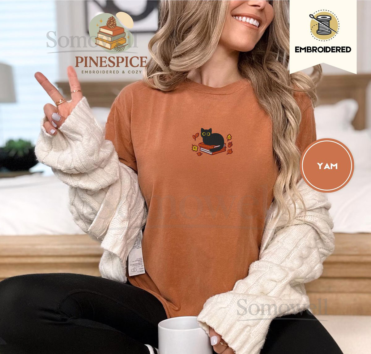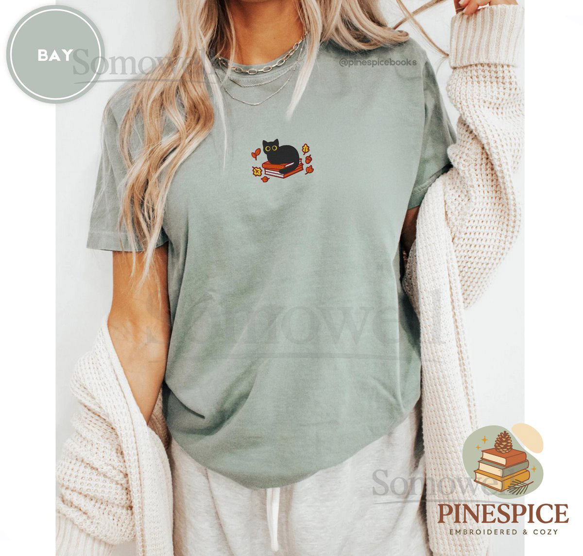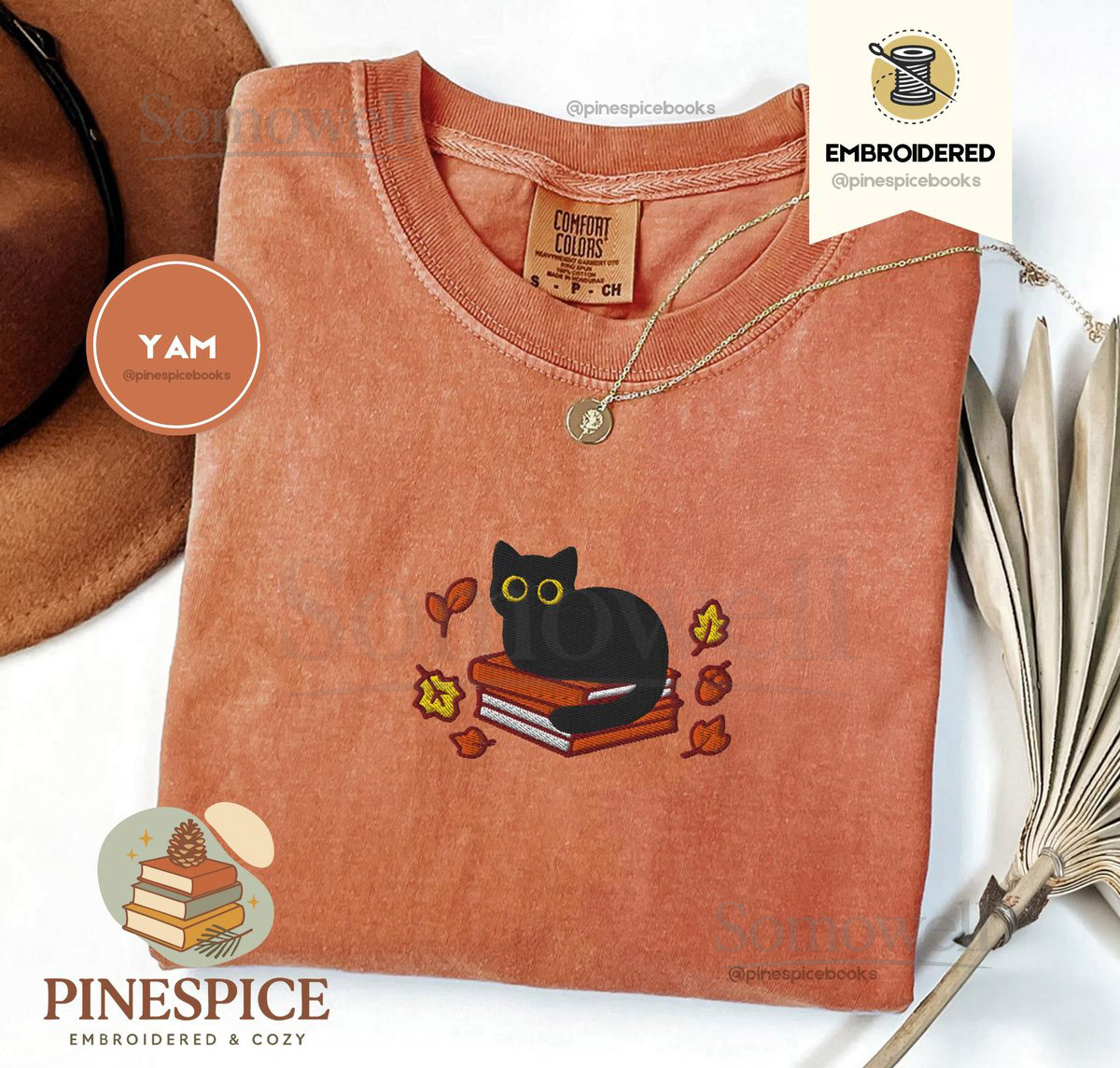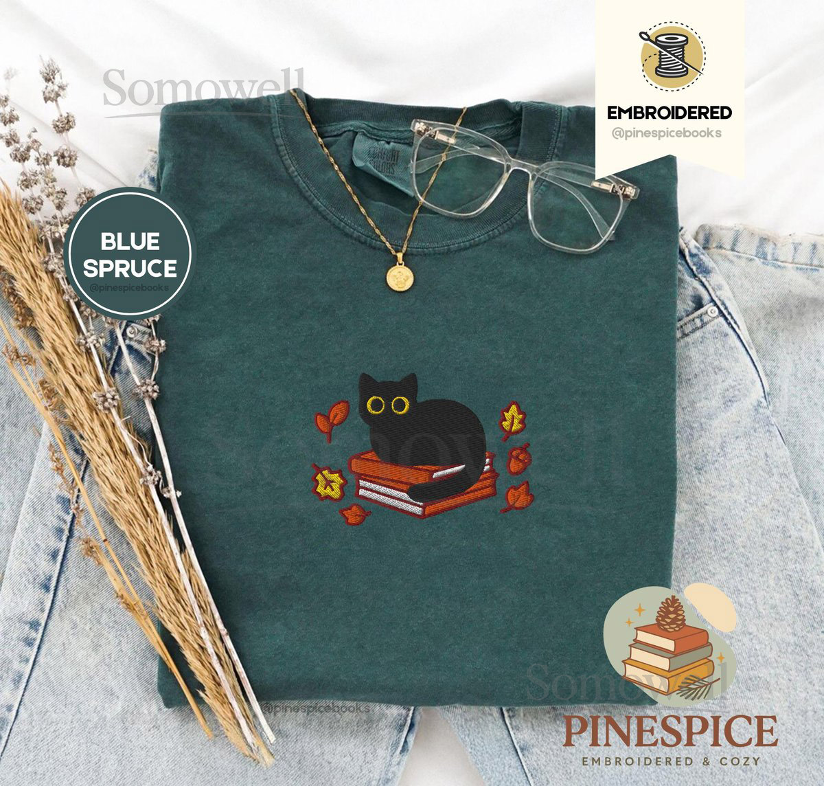 Fall Black Cat and Books Tee Embroidered Comfort Colors 1717 Cozy Autumn Reader Shirt Book Lover Gift Cute Halloween Cat Shirt_110