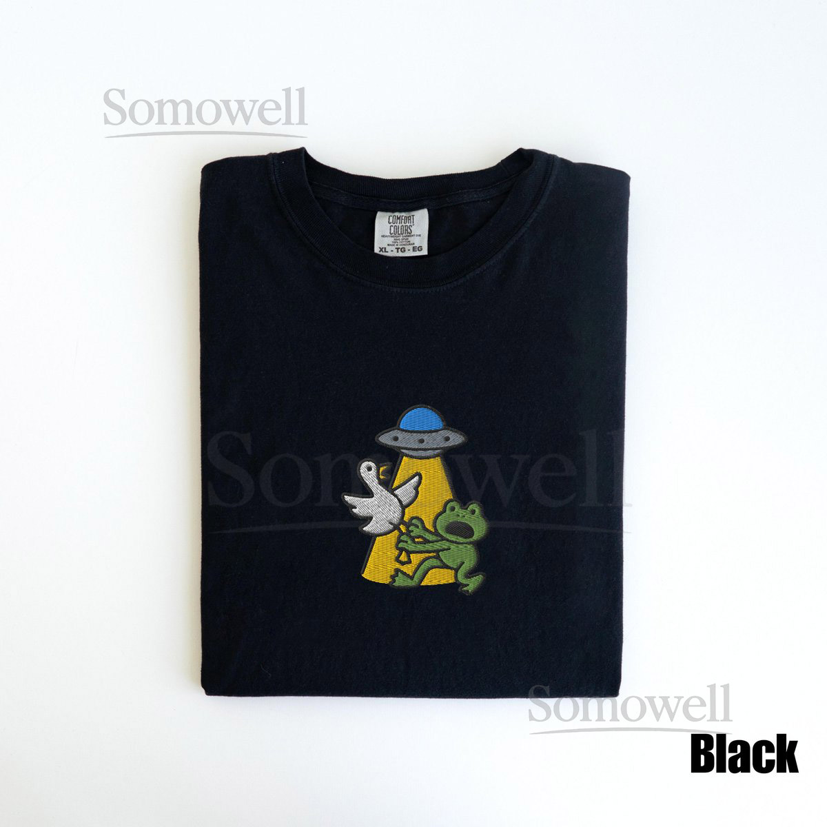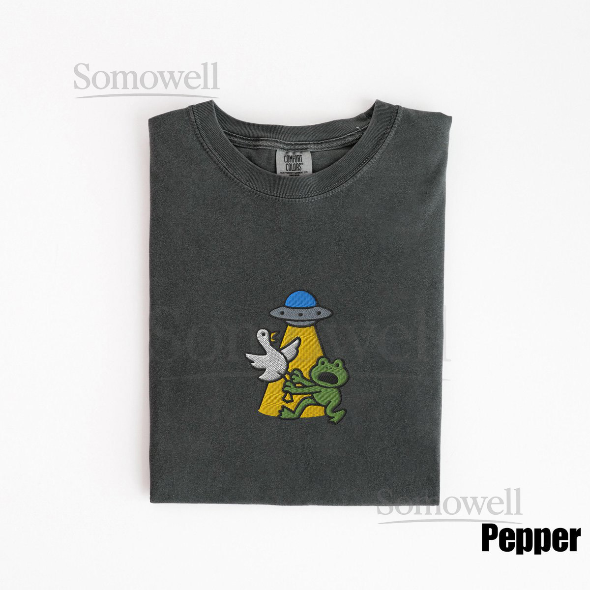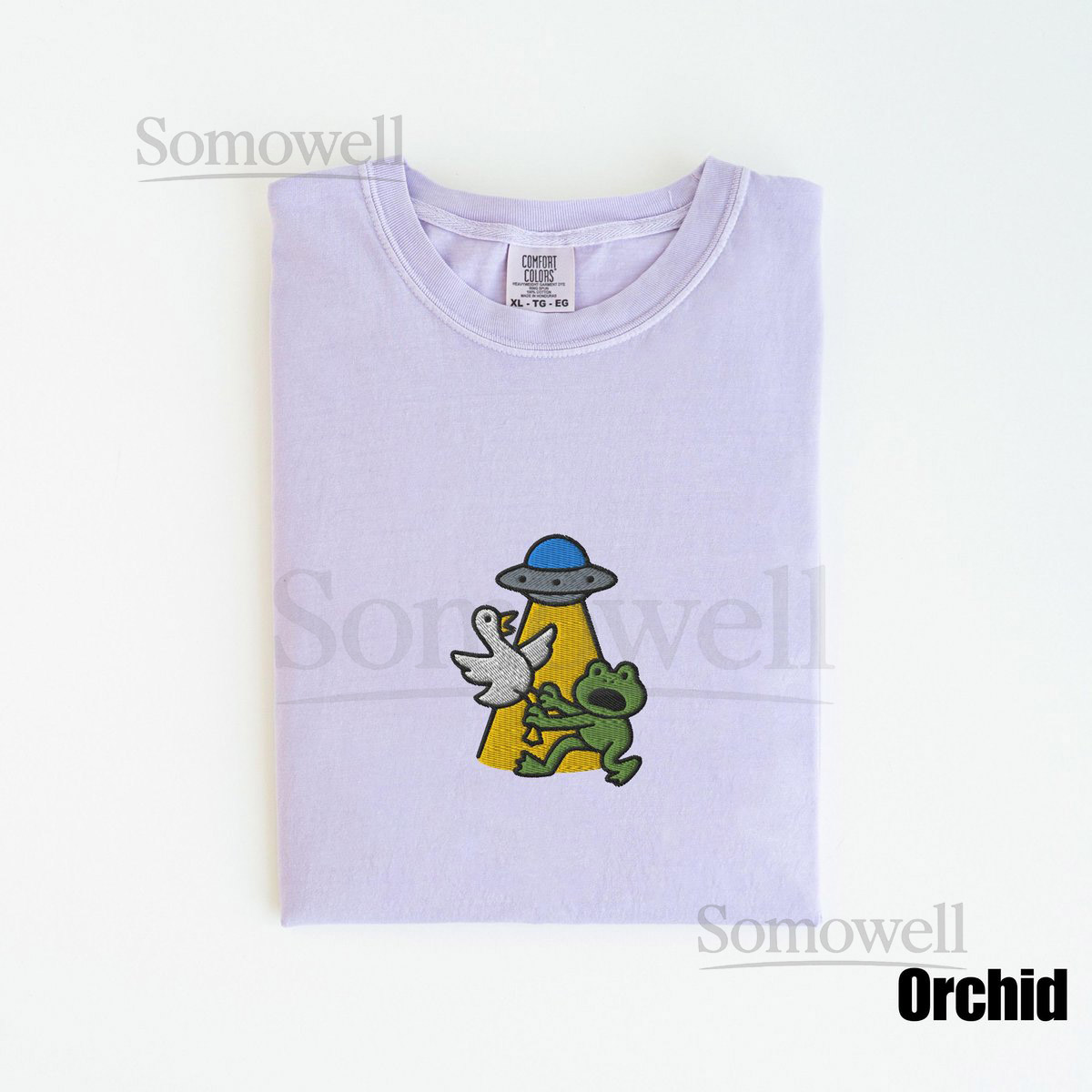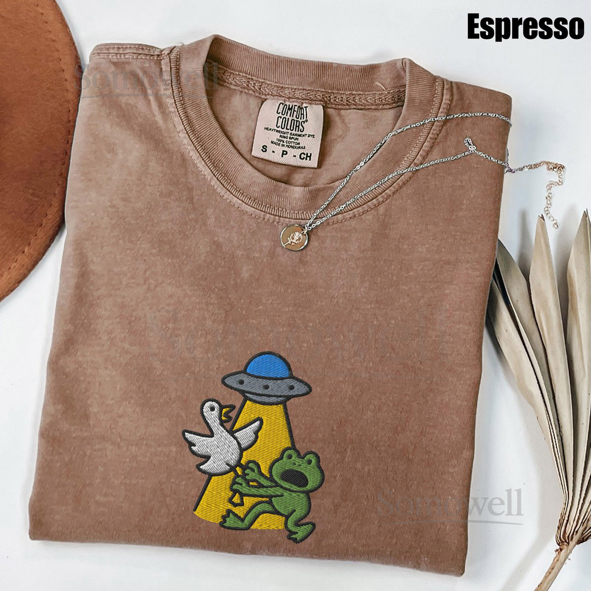 Goose Abduction Embroidered Comfort Colors T-Shirt Frog and UFO Funny Shirt Weirdcore Animal Tee Alien Abduction Gift for Her or Him_119