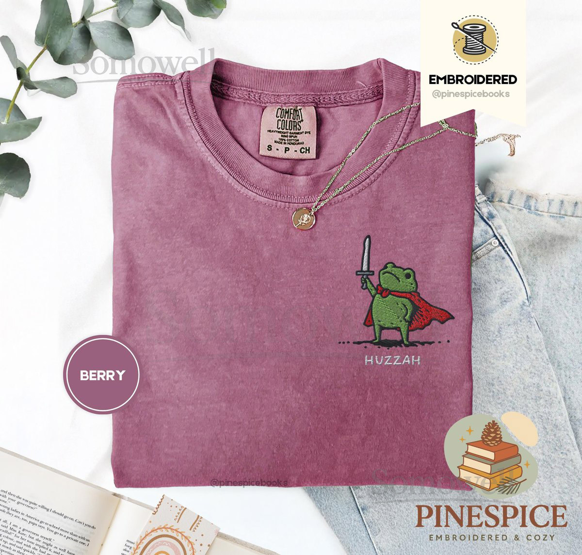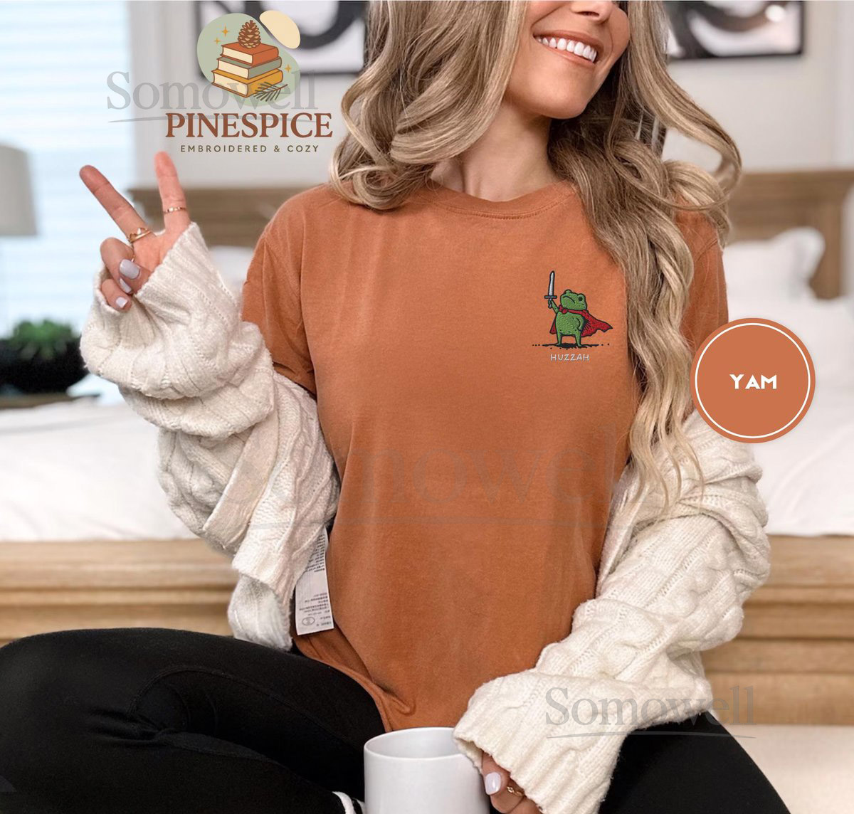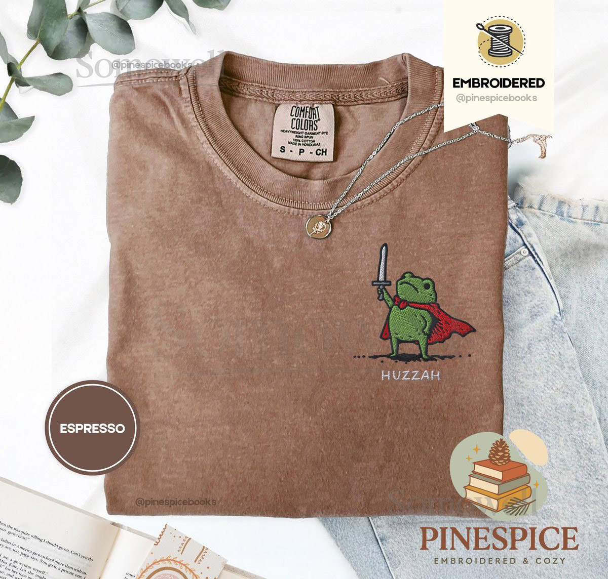 Huzzah Frog with Sword Tee Embroidered Medieval Frog Shirt Comfort Colors 1717 Funny DnD T-Shirt Renaissance Faire Frog Gift_127