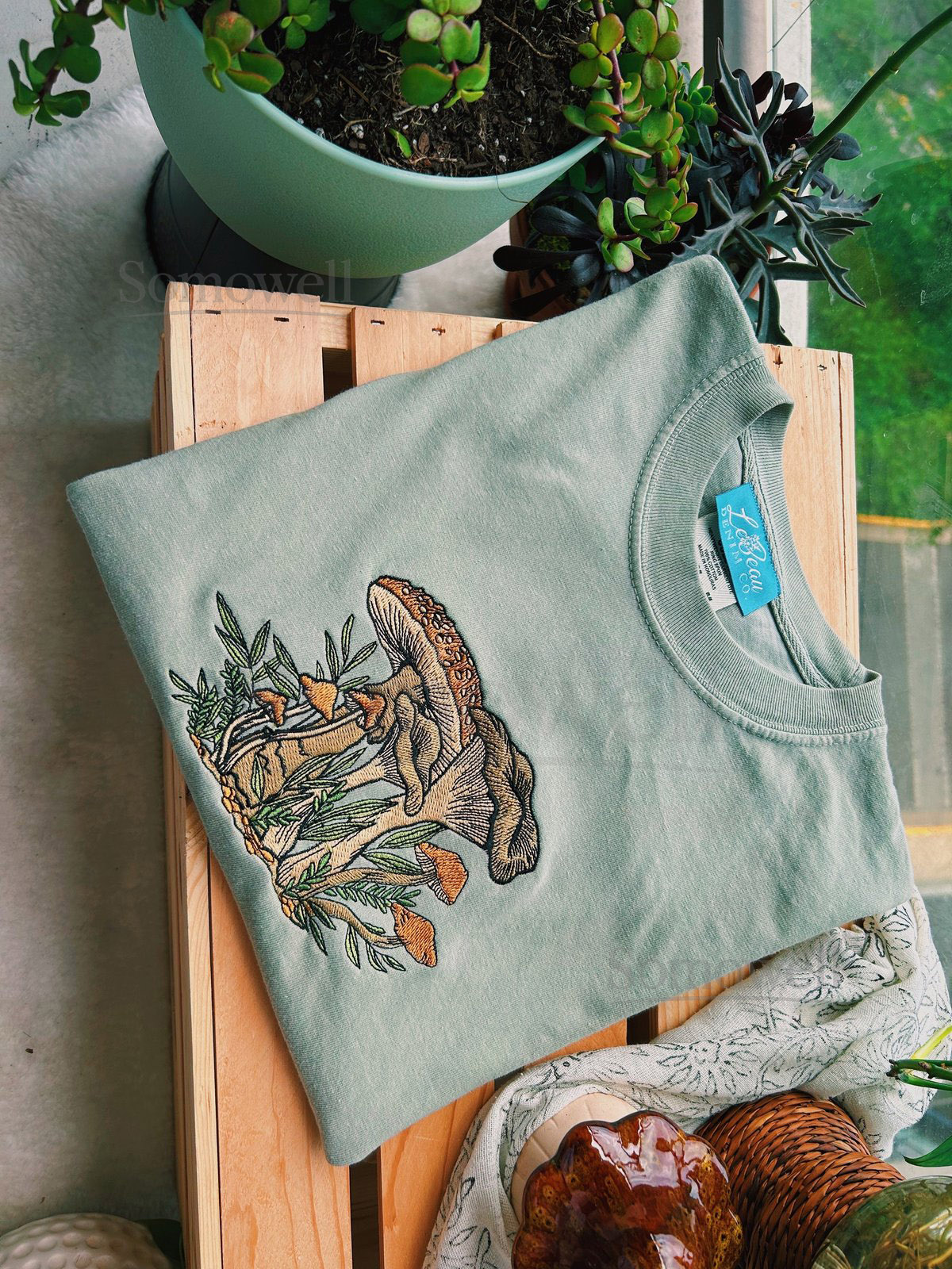 Khaki Fungi Foliage Tee Embroidered – Womens Unisex 100 cotton t-shirt – Gifts for – Cottagecore – Granola – comfort colors_136