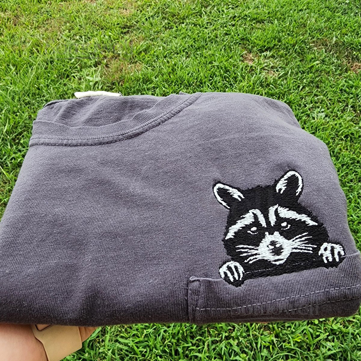 Raccoon pocket t-shirt comfort colors embroidered shirt cute raccoon pocket tee cute every day tee gift for her trendy trash panda_157