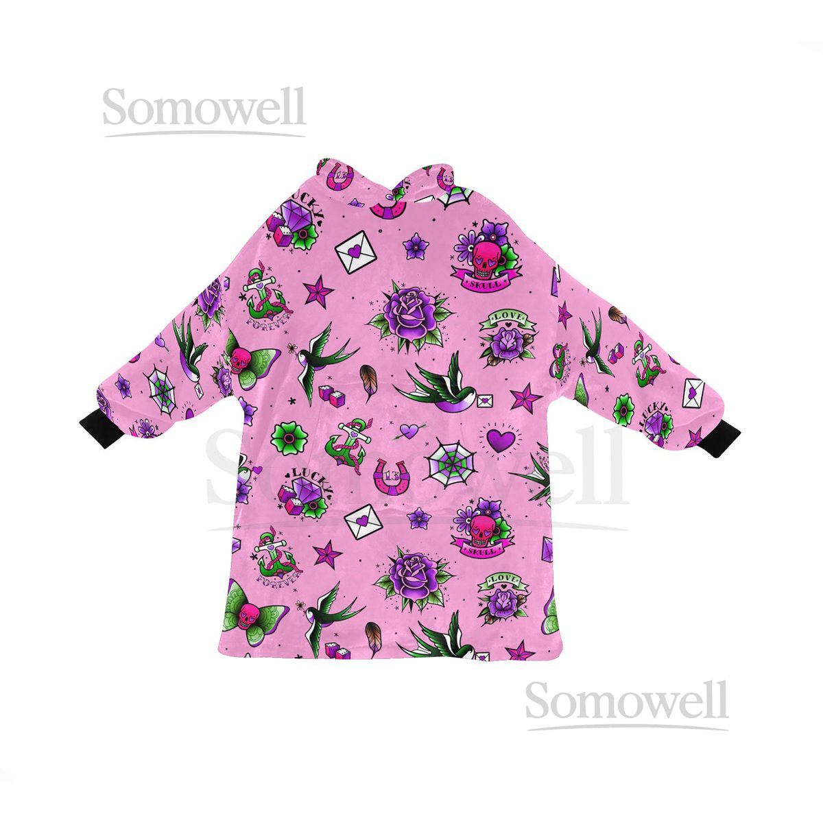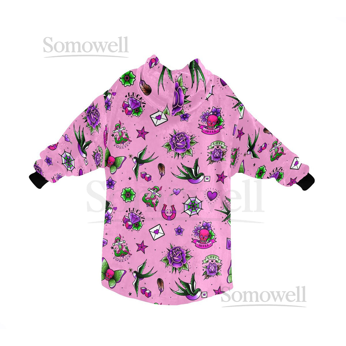 Pink Retro Tattoo Theme Blanket Hooded Jumper Hoodie Winter Oversized Kids Adults_65