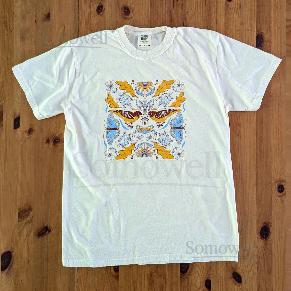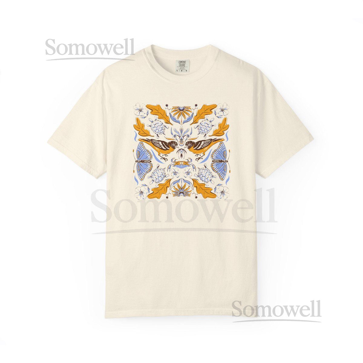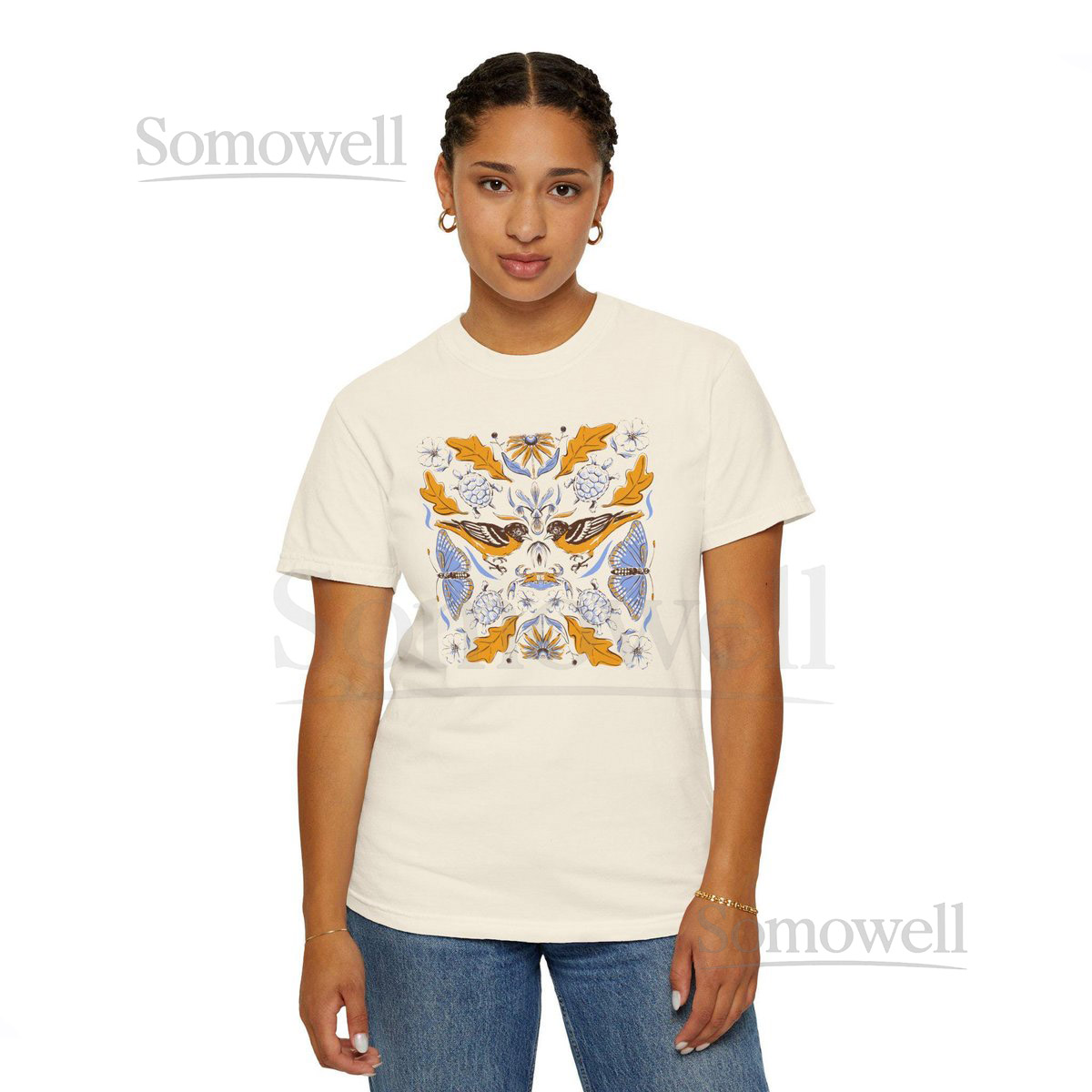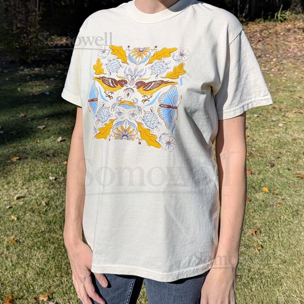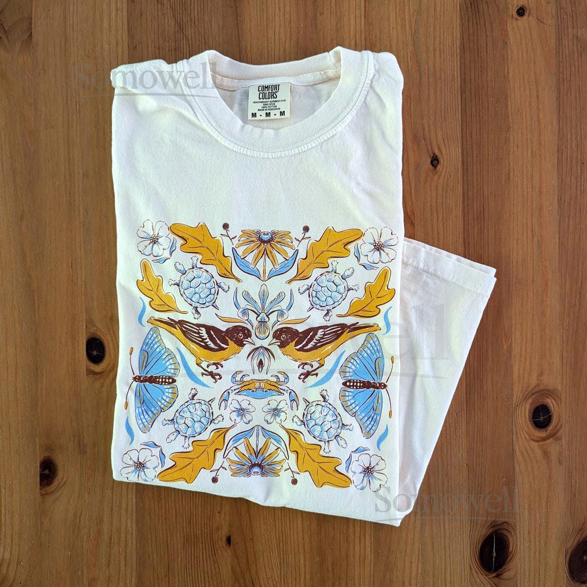 Folk Nature T-Shirt Hand-Drawn Botanical Birds Butterflies Oak Leaves Inspired by Maryland_316