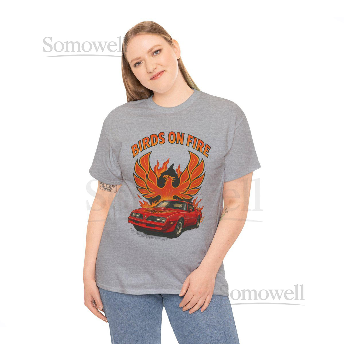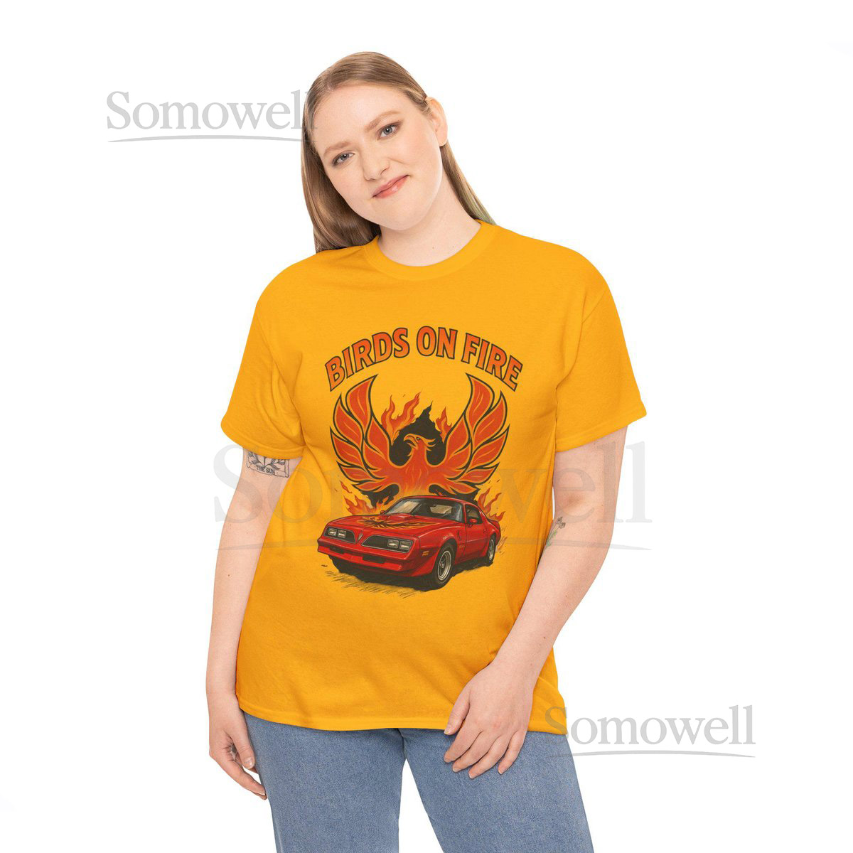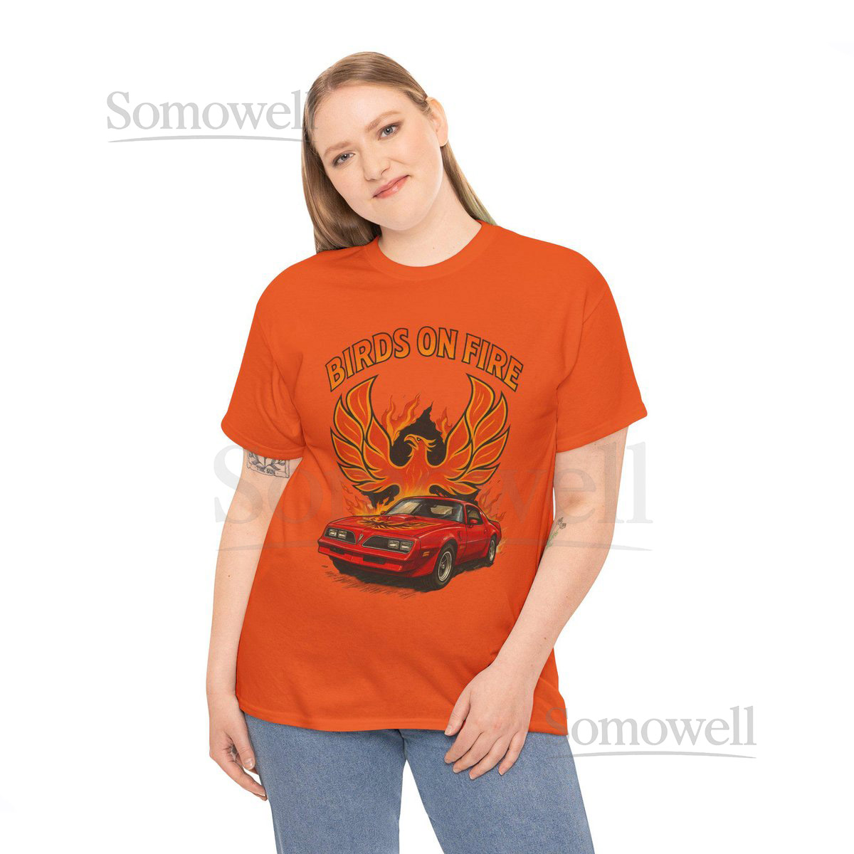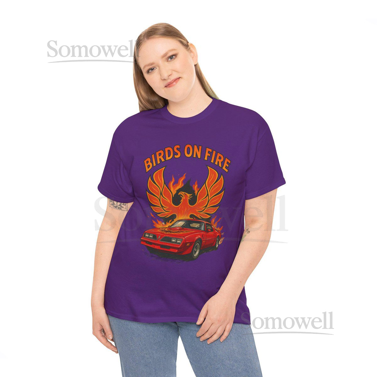 Birds on Fire phoenix and vintage muscle car Tee retro flame graphic_30