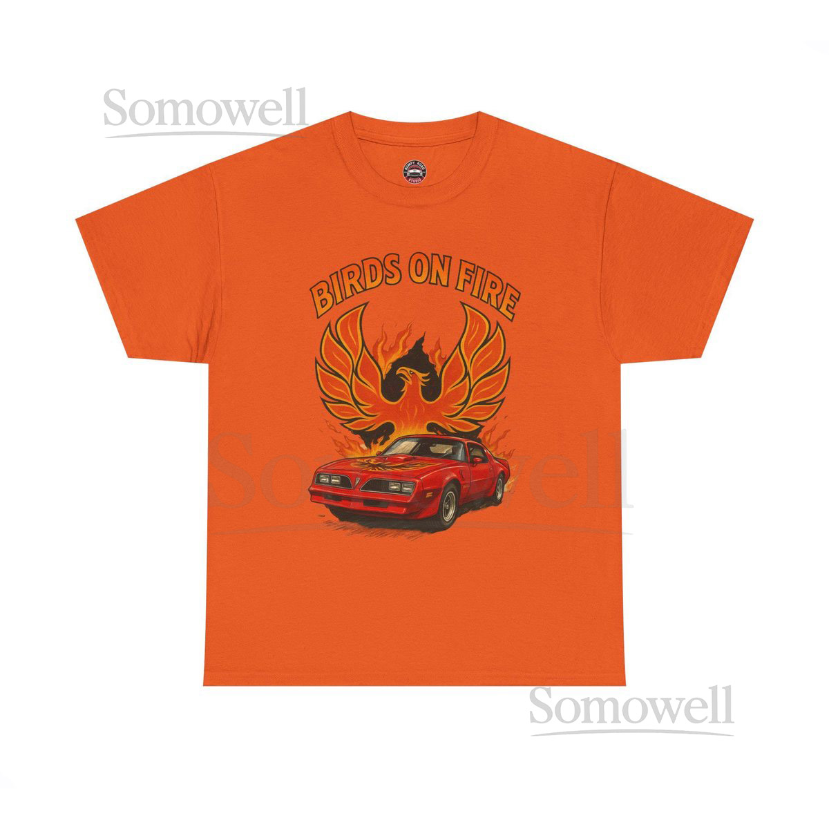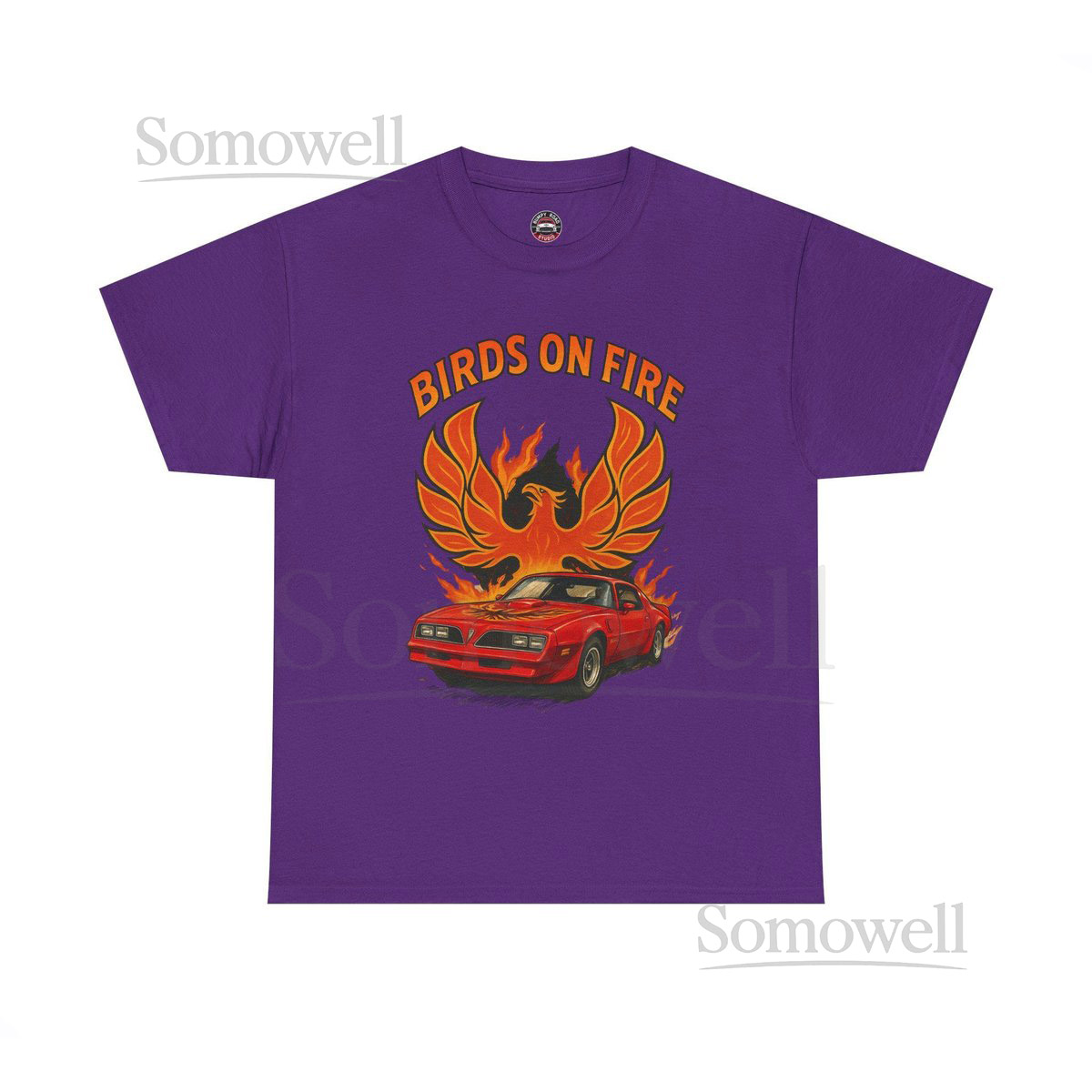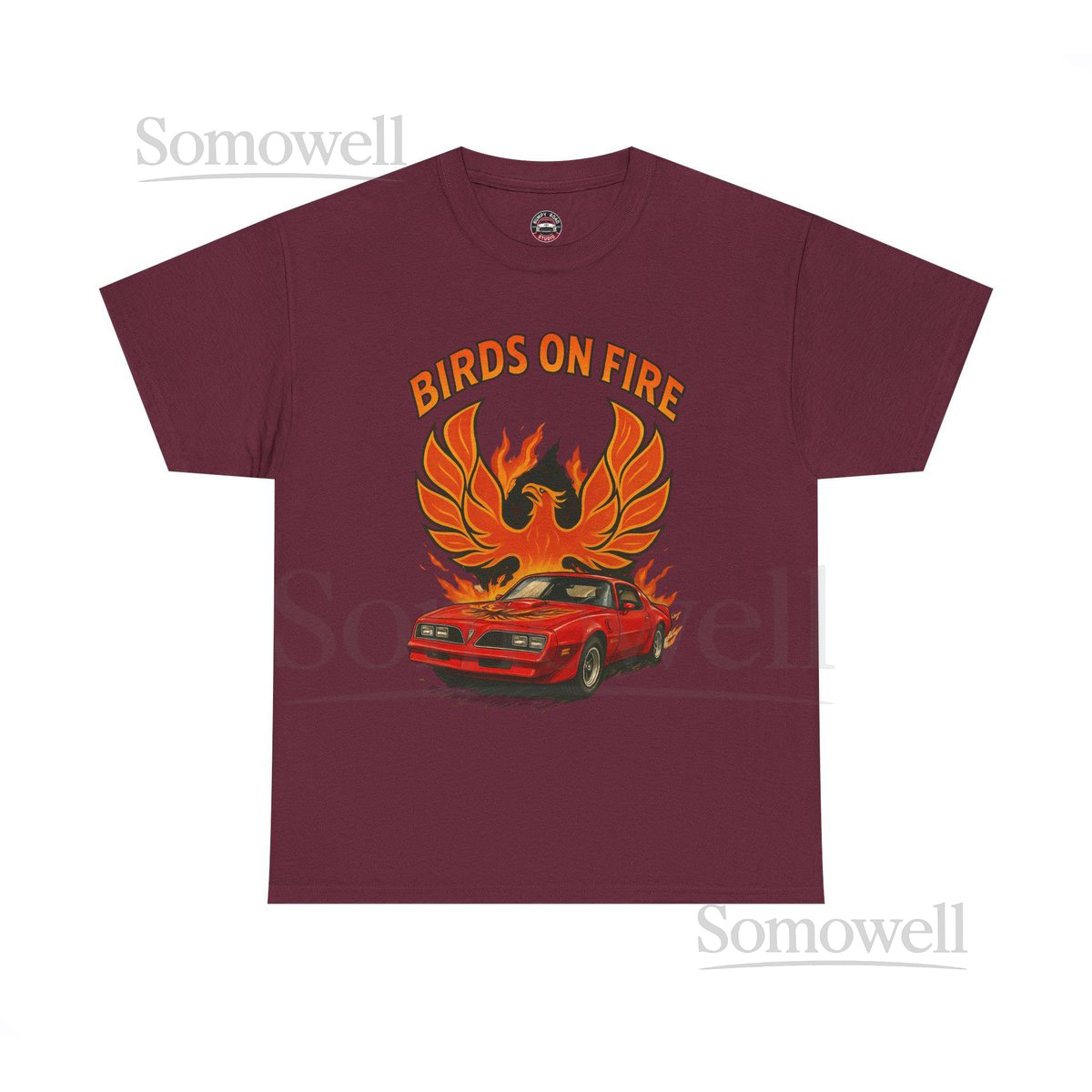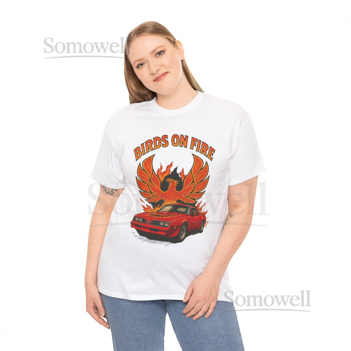 Birds on Fire phoenix and vintage muscle car Tee retro flame graphic_30