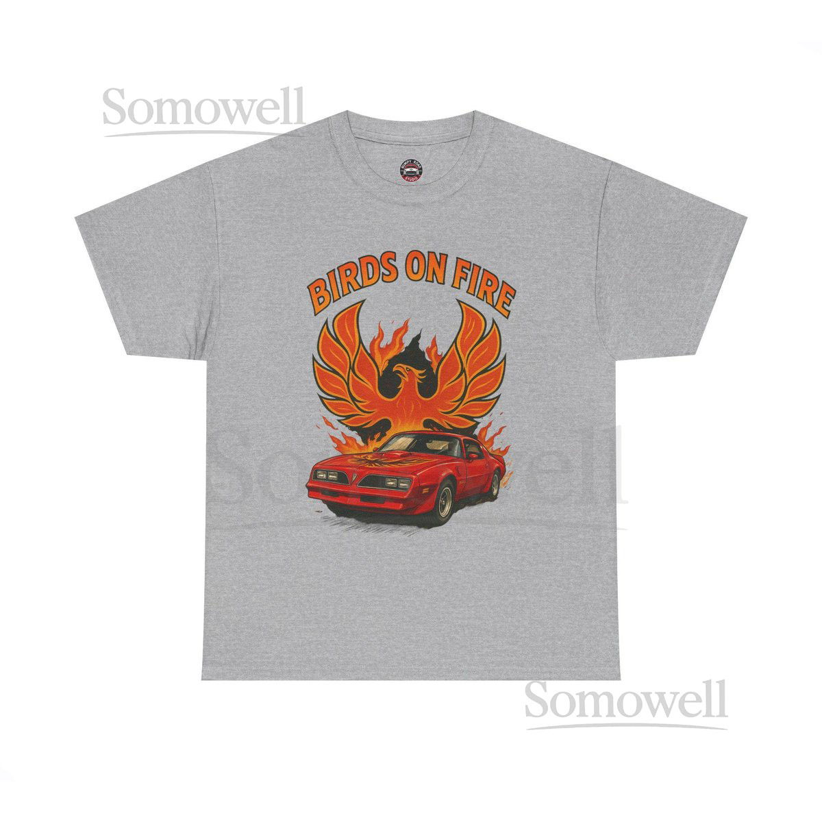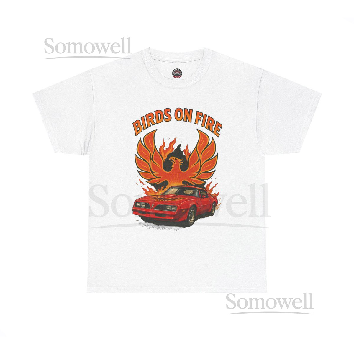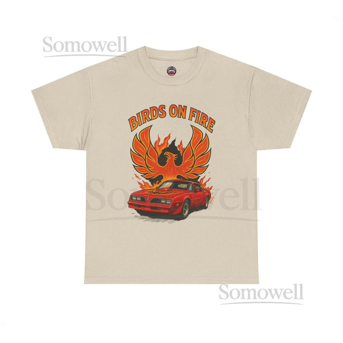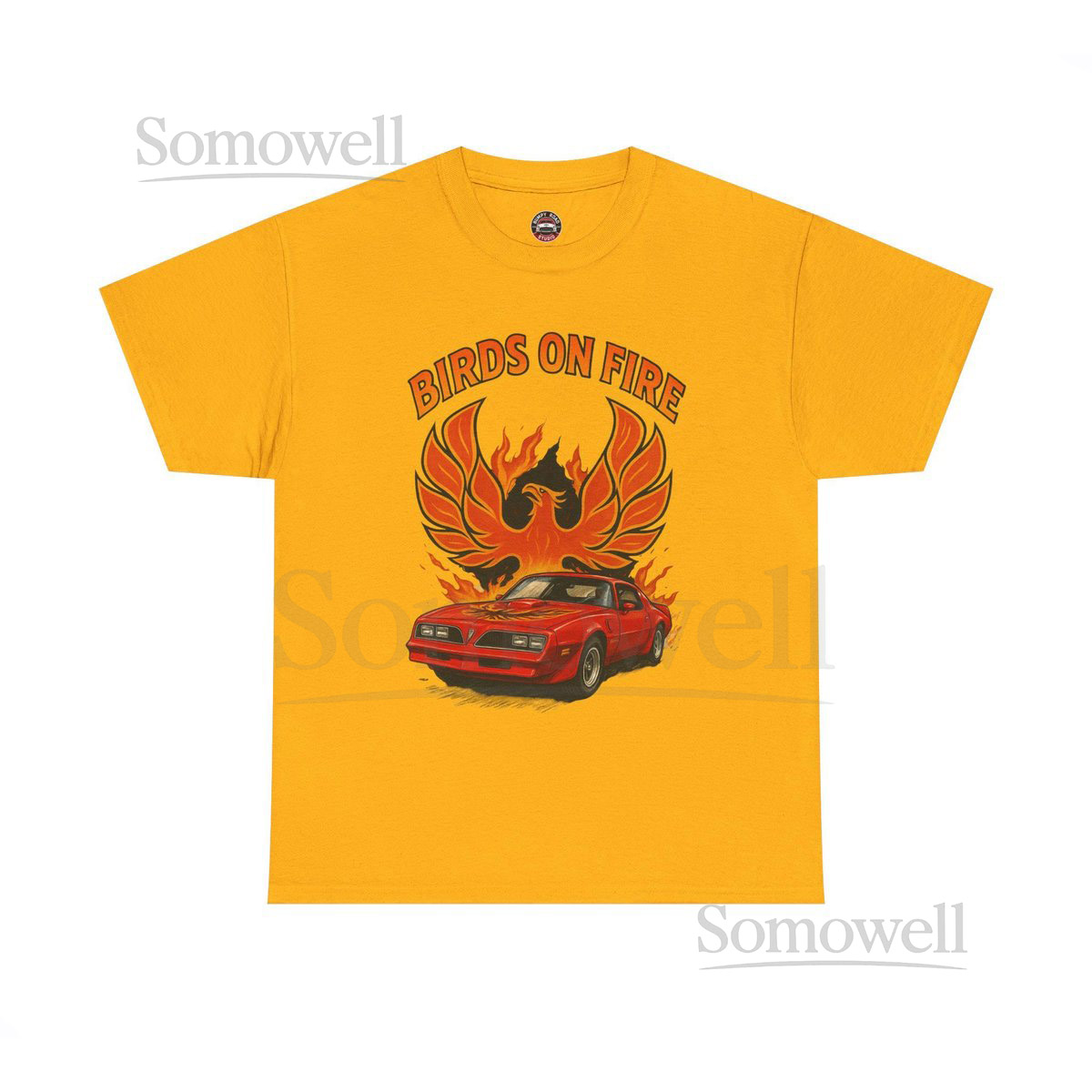 Birds on Fire phoenix and vintage muscle car Tee retro flame graphic_30