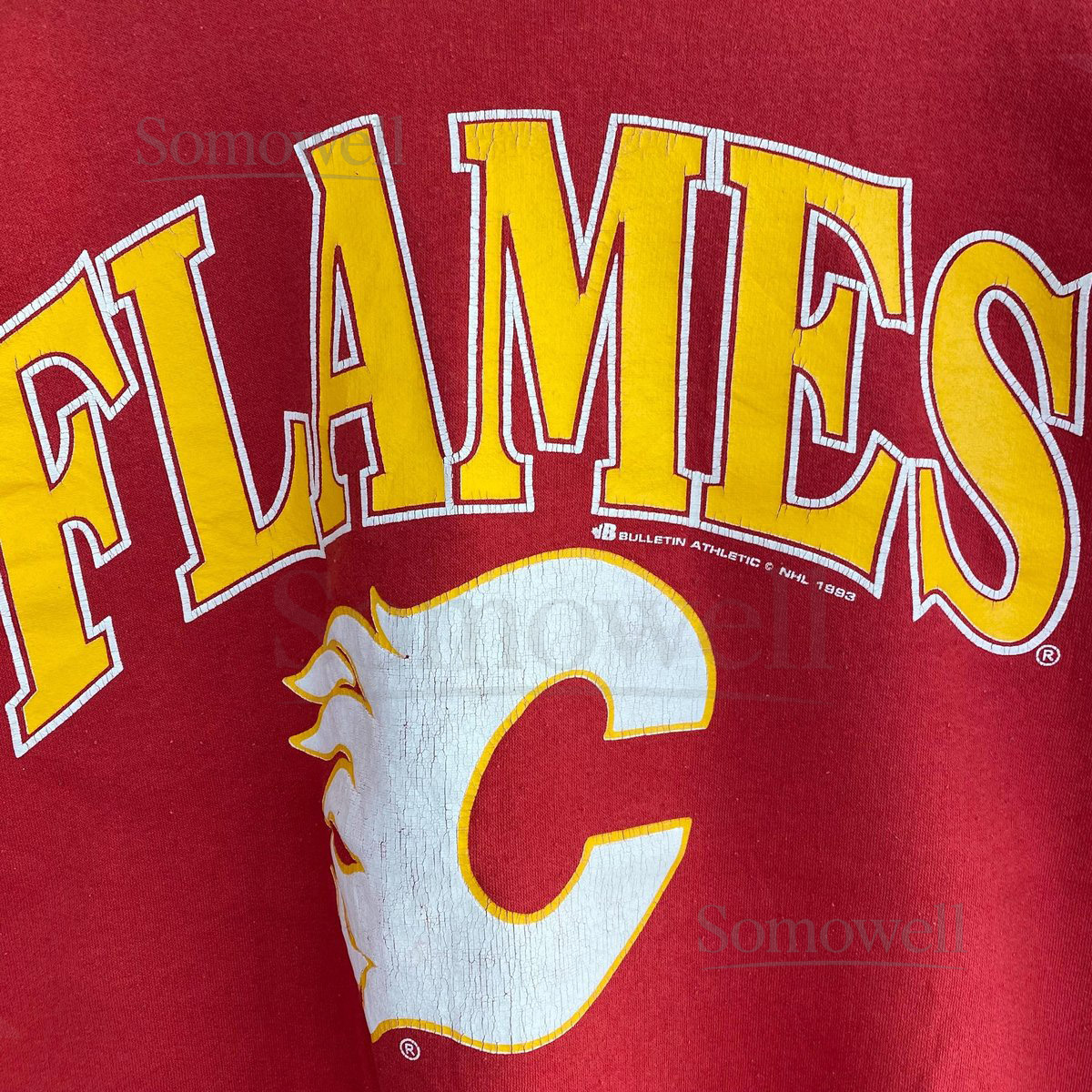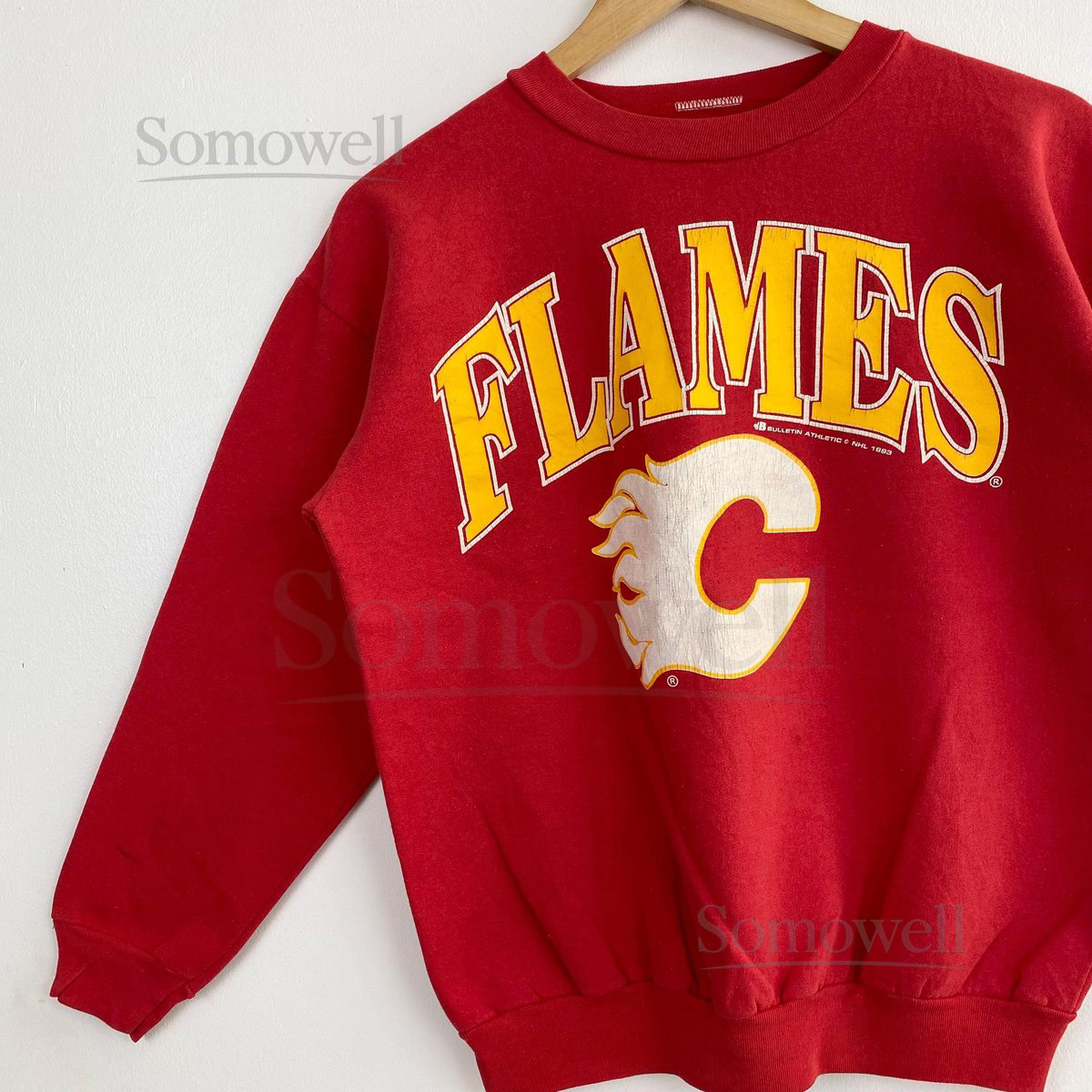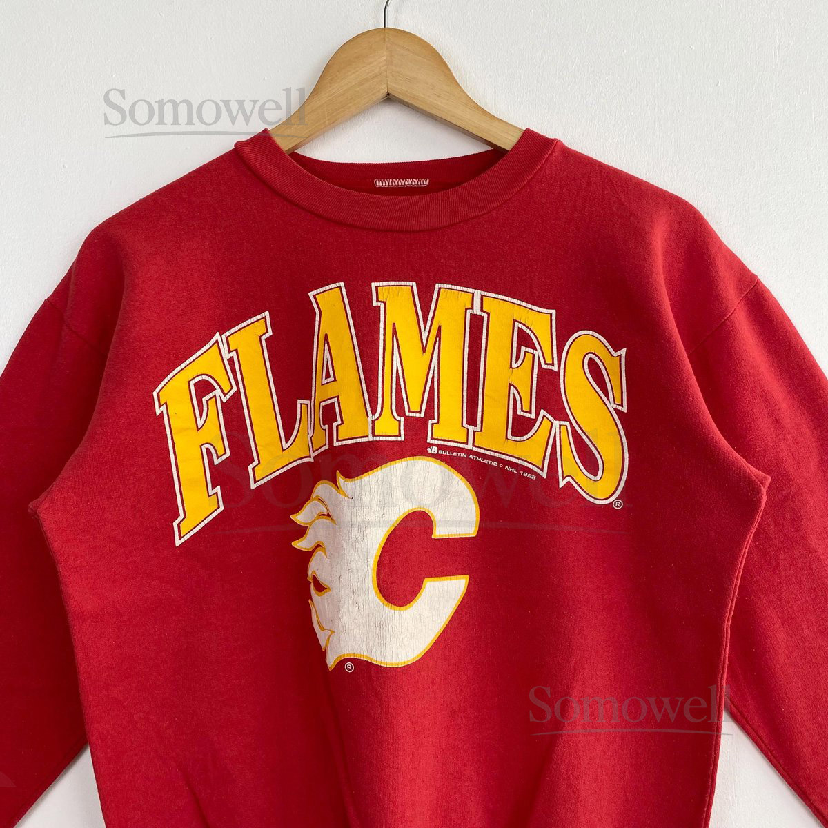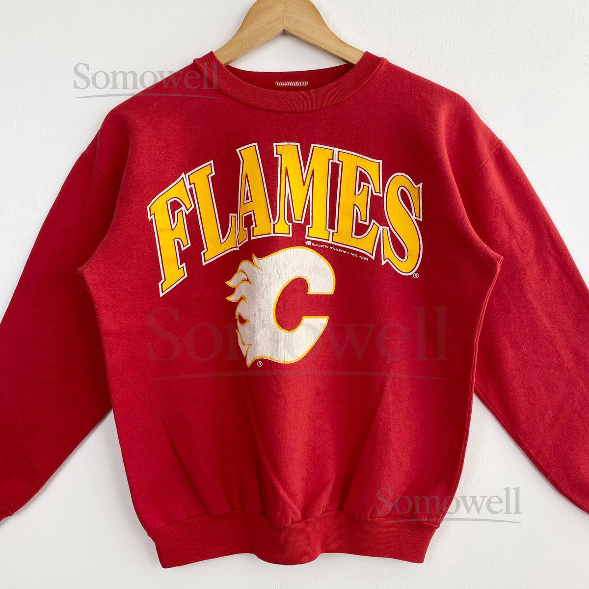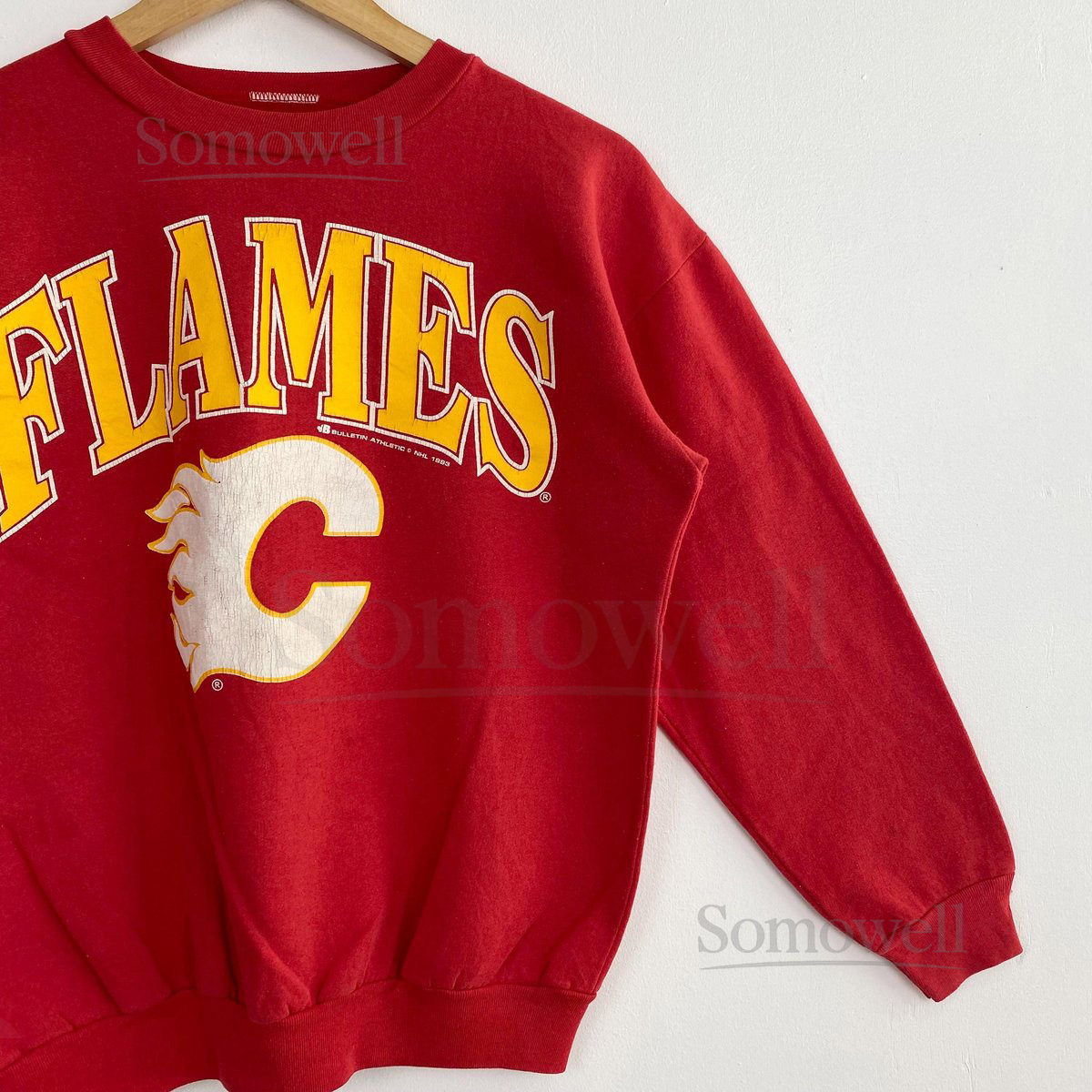 80s NHL Calgary Flames Crewneck Sweatshirt Print Logo Red Color Mens S_1